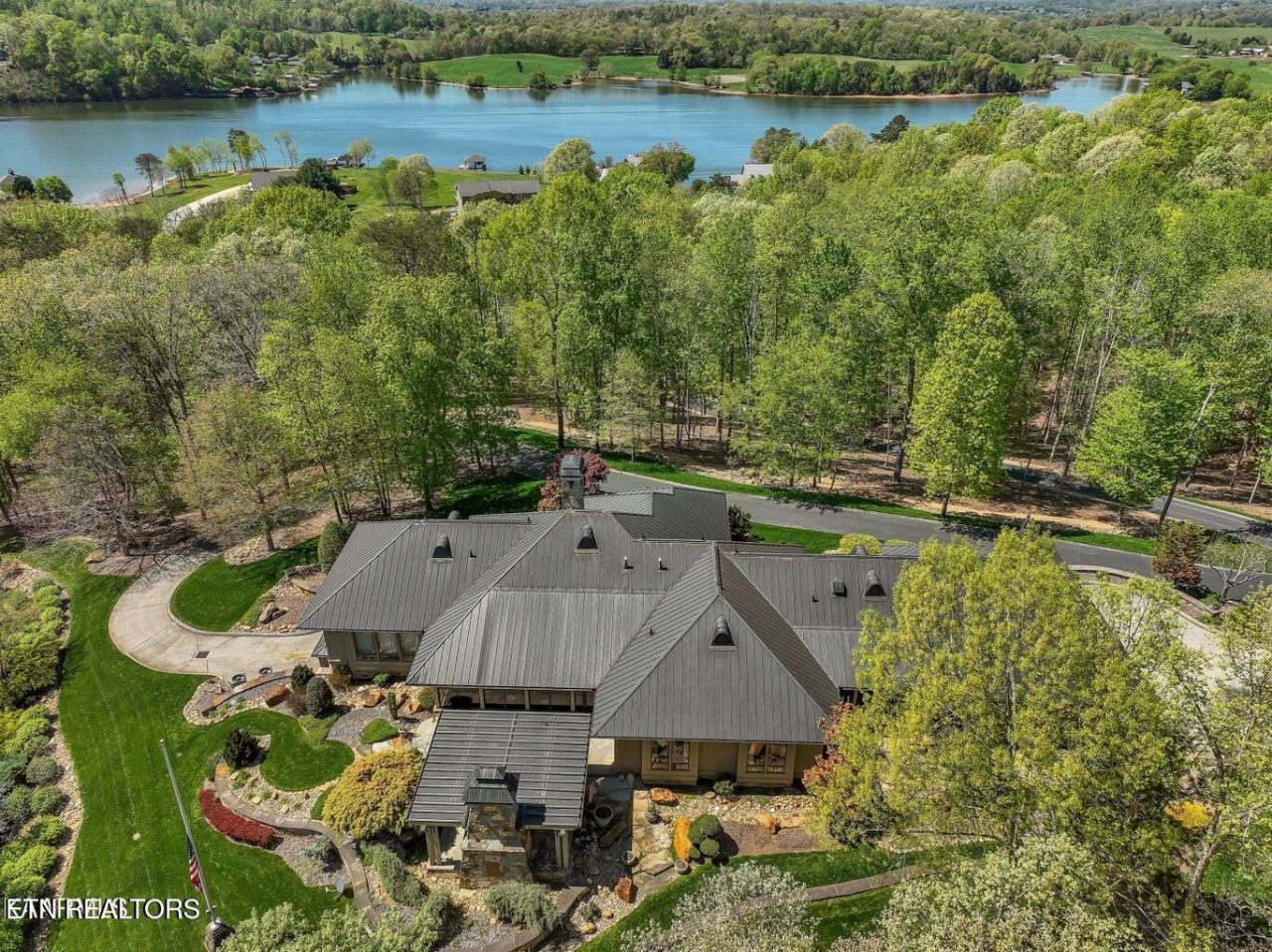 One of a kind Estate designed by the Seller and inspired by Frank Lloyd Wright's Prairie Home Series nestled on 5 acre lot overlooking Fort Loudon Lake. The home has been constructed with all natural materials including pine and cypress crown molding, hand scraped reclaimed walnut flooring, cypress beams and piers, natural stone, tongue and groove pine, an abundance of flagstone, copper guttering and copper roof. The meticulous and detailed craftsmanship of the home is apparent. The entire acreage is manicured with extensive landscaping and thoughtfulness. A spacious foyer welcomes you into this warm inviting home. Many happy times and entertaining await you with this wonderfully designed floor plan. A spacious custom kitchen includes an abundance of cabinetry, granite, professional Wolf gas range (6 burner & griddle), ice maker, island, pantry cabinet as well as additional pantry storage. Moving into the living room (8 foot walnut doors throughout home) the focal point is the breath taking natural stone floor to ceiling fireplace. Solid hand worked beams were fitted on site and are throughout the structure. A favorite room of the home is the bright den area with picturesque views of the property. The Sun Room is a welcoming space looking out on the gazebo area with natural stone fireplace for outdoor entertaining. Both spaces are outfitted with motorized blinds. An inviting primary bedroom with natural stone shower, custom walk in closet and exquisite double vanity and storage area. There are two additional main level en-suite bedrooms with walk in closets. All hardware in the home was custom designed by the Seller - drapery rods (finials, rings, brackets), door hardware and trim, brackets for the beams and piers as well as mirror supports. All designed with matching finish and style. A 27 seer heating and air system services the home allowing for even temperatures throughout. Park your vehicles in the spacious three car side entry garage with polished concrete flooring and wooden carriage style doors. The lower level is a walk out plumbed space with expansive recreation room. A brick fireplace is the focal point of the room, this space can be completed to suit the new owner's needs.